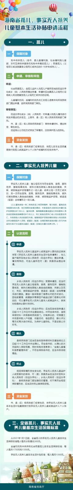 一图读懂海南省孤儿、事实无人抚养儿童基本生活补贴申请流程一图读懂海南省孤儿、事实无人抚养儿童基本生活补贴申请流程