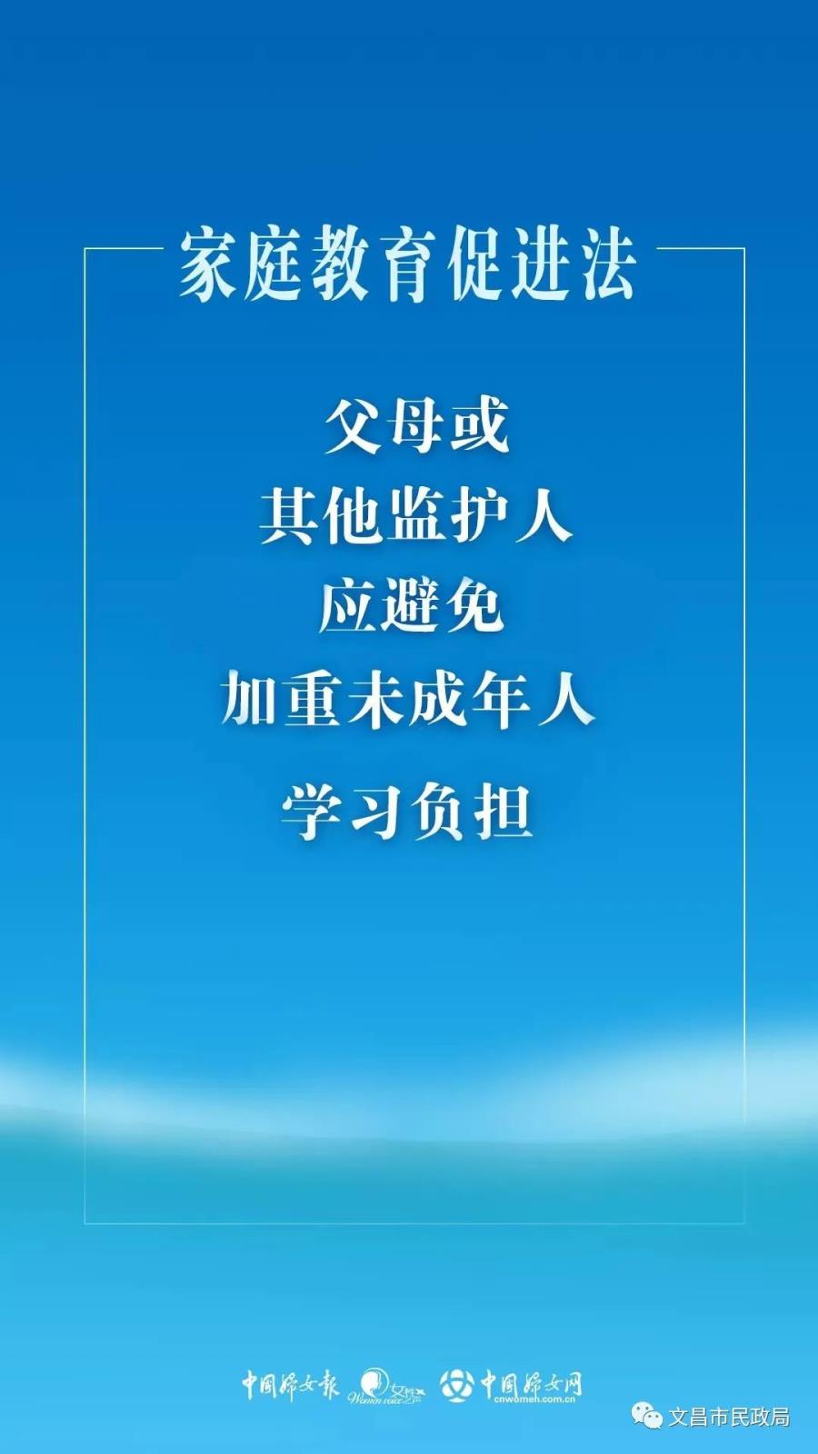 十三届全国人大常委会第三十一次会议23日表决通过了家庭教育促进法。法律明确,未成年人的父母或者其他监护人负责实施家庭教育。国家和社会为家庭教育提供指导、支持和服务。为呼应减轻义务教育阶段学生作业负担和校外培训负担的“双减”要求,法律规定,县级以上地方人民政府应当加强监督管理,减轻义务教育阶段学生作业负担和校外培训负担,畅通学校家庭沟通渠道,推进学校教育和家庭教育相互配合。未成年人的父母或者其他监护人应当合理安排未成年人学习、休息、娱乐和体育锻炼的时间,避免加重未成年人学习负担,预防未成年人沉迷网络。