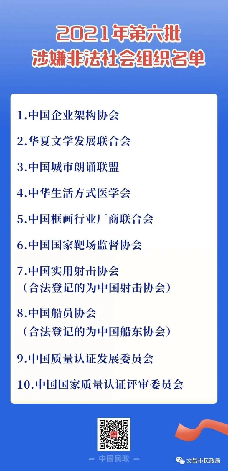 为进一步加大对非法社会组织的打击整治力度,充分发挥社会监督作用,现公布2021年第六批涉嫌非法社会组织名单,请社会公众提高警惕,避免上当受骗。如发现下列组织的活动线索(如活动场所、 负责人等),请登录“中国社会组织政务服务平台”“投诉举报”栏目进行投诉举报。