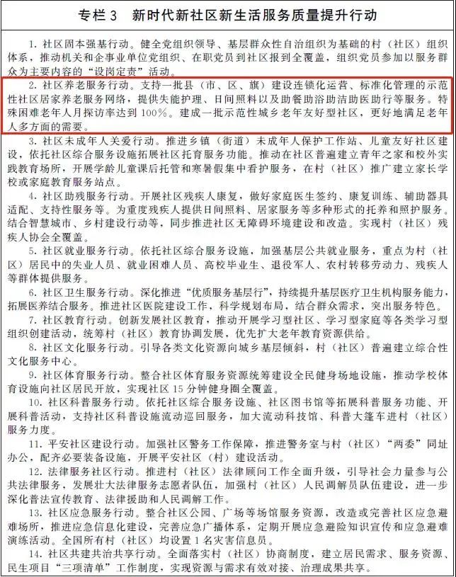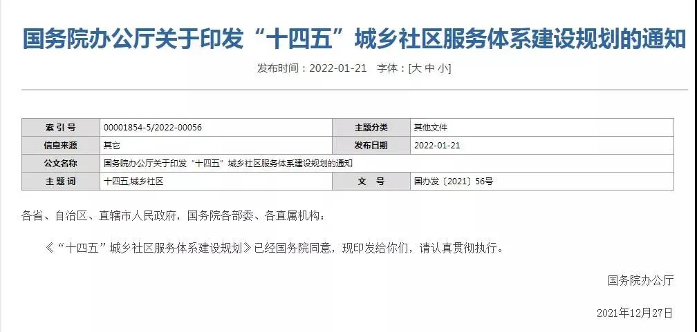 国务院办公厅印发“十四五”城乡社区服务体系建设规划的通知(以下简称《规划》),规划中提到必须围绕中心、服务大局,优先发展社区就业、养老、托育服务,大力发展社区服务业。要加快推动政务服务平台、社区感知设施、家庭终端和城乡安全风险监测预警系统建设及互联互通,发展实时监测、智能预警、应急救援救护和智慧养老等社区惠民服务应用。