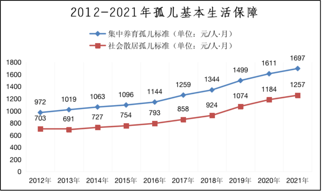 一是切实加强孤儿基本生活保障。积极协调有关部门提高孤儿基本生活费标准,从2019年起,提高中央财政补助孤儿基本生活费标准,提高幅度达50%。截至目前,全国共有孤儿16.9万人,其中集中养育孤儿5.2万人,社会散居孤儿11.7万人,全国集中养育孤儿平均保障标准为1728.2元/人·月,社会散居孤儿平均保障标准为1288元/人·月。