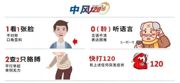 要快速判别卒中与否,有简单形象的方法,就是牢记“中风120”: