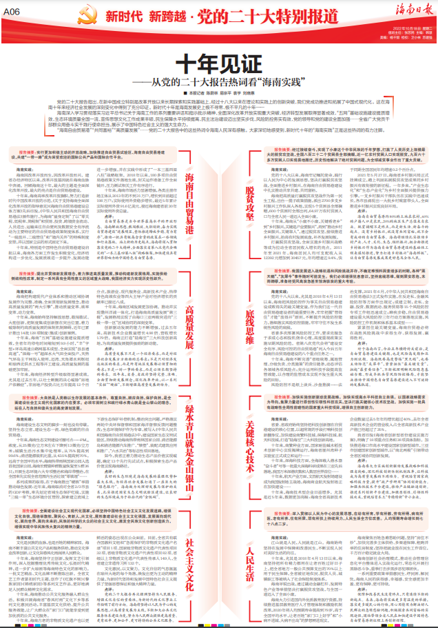 “海南自由贸易港”“共同富裕”“高质量发展”……党的二十大报告中的这些热词令海南人民深有感触。大家深切地感受到,新时代十年的“海南实践”正是这些热词的有力注脚。