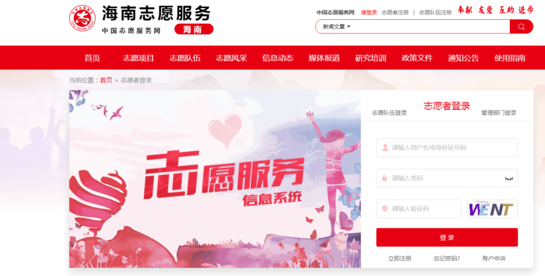 中国志愿服务网是国务院民政部门指定的志愿服务信息系统,有关志愿服务项目发布及志愿服务时长登记均需通过该系统,快来加入成为海南志愿者吧!