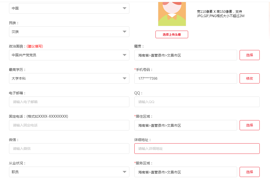 第九步:完善个人信息(注:点击“服务区域”选择文昌市)