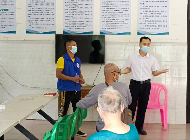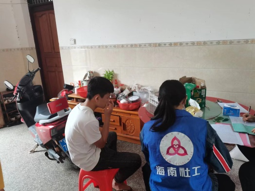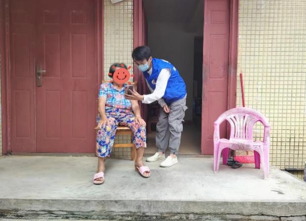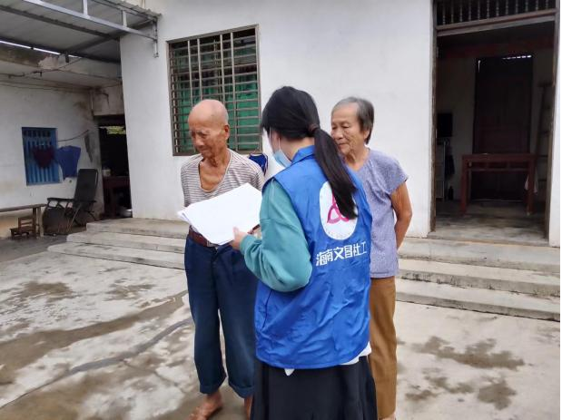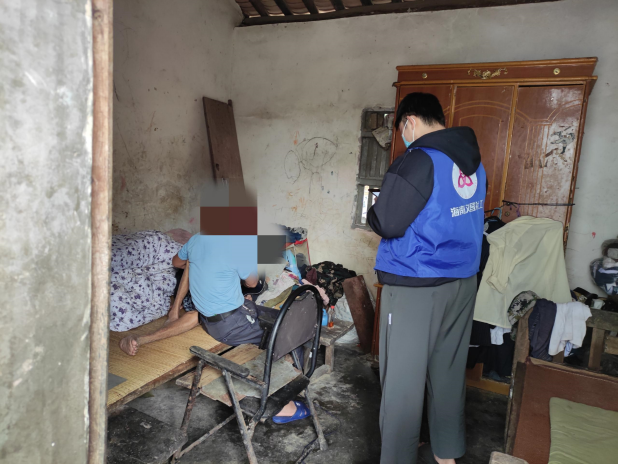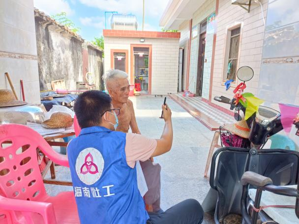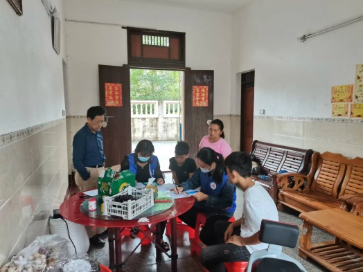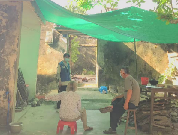在A村委会干部的带领下共同入户,初次与符爷爷见面,社会工作者用亲切感十足的方言与符爷爷打招呼并询问有什么需求,符爷爷有些许耳背,但也尽力与社工们交流,社会工作者耐心倾听,点头微笑,同时给予肢体支持,想更多地了解符爷爷的需求,倾听符爷爷的心声,给予其一些力所能及的帮助。