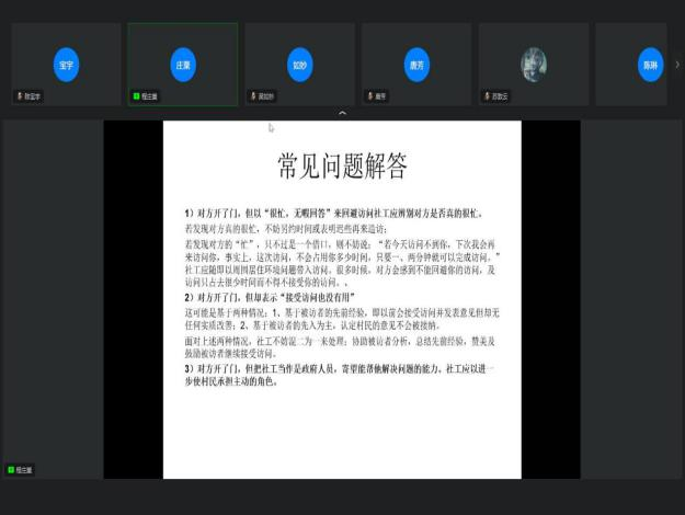 11月10号,益海社会服务发展中心开展线上培训,参加总人数共计58人。培训分为两大板块,入户探访和活动策略。培训结束以后,个别社工还针对培训内容进行了相关的提问,项目主管也一一给予了解答。