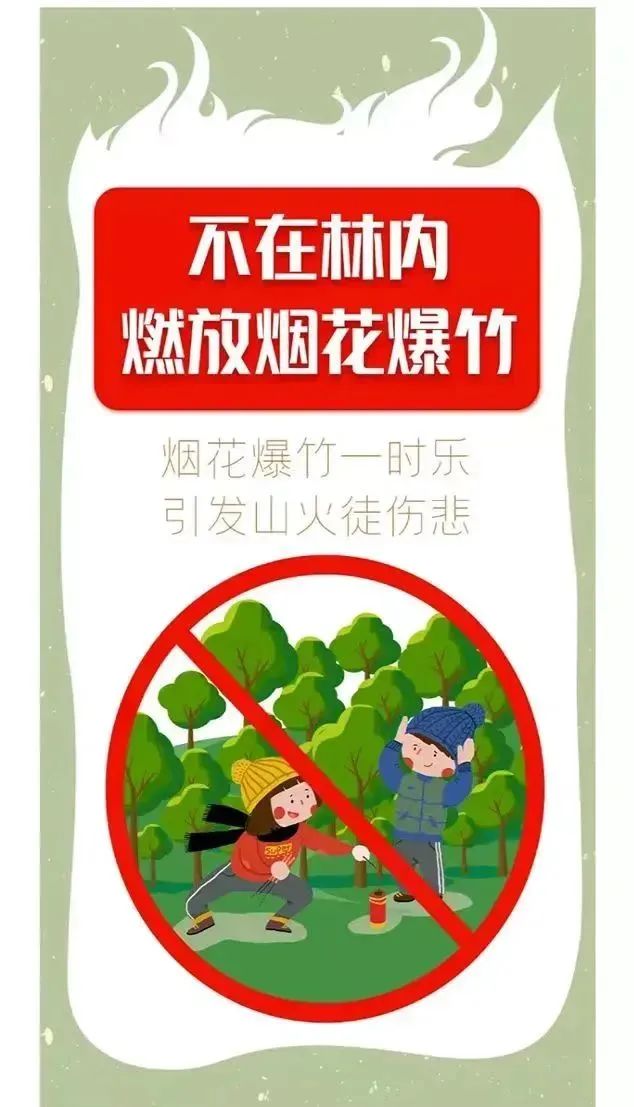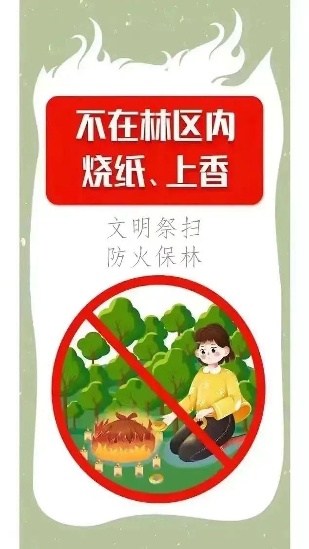 倡导鲜花祭扫、无烟祭扫、网络祭扫等绿色环保的祭扫方式,表达对亲人的缅怀之情。树立环保意识,不携带火种和易燃易爆物品进入墓地、林地等火灾易发场所,严格遵守森林防火管理规定,严禁在森林防火区扫墓上坟烧纸、焚香、点蜡烛、放鞭炮,严防发生森林火灾。