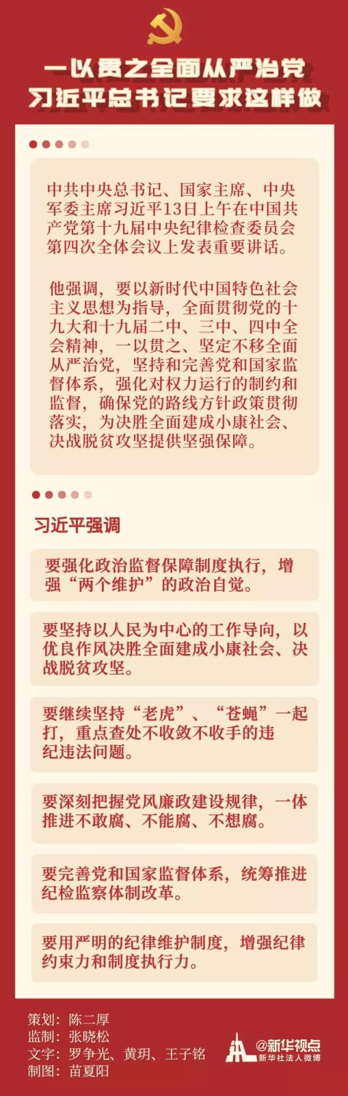 13日召开的十九届中央纪委四次全会上,习近平总书记发表重要讲话,对新时代继续推进全面从严治党提出一系列重要要求。